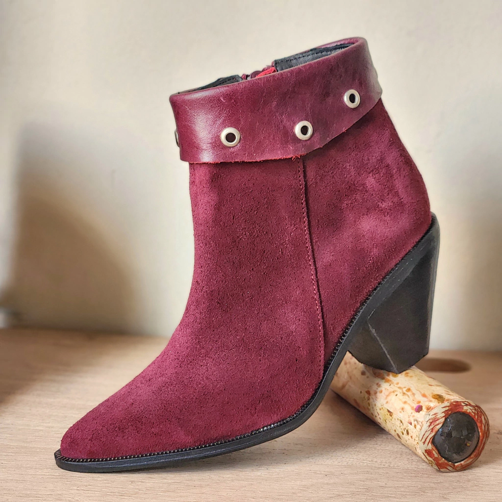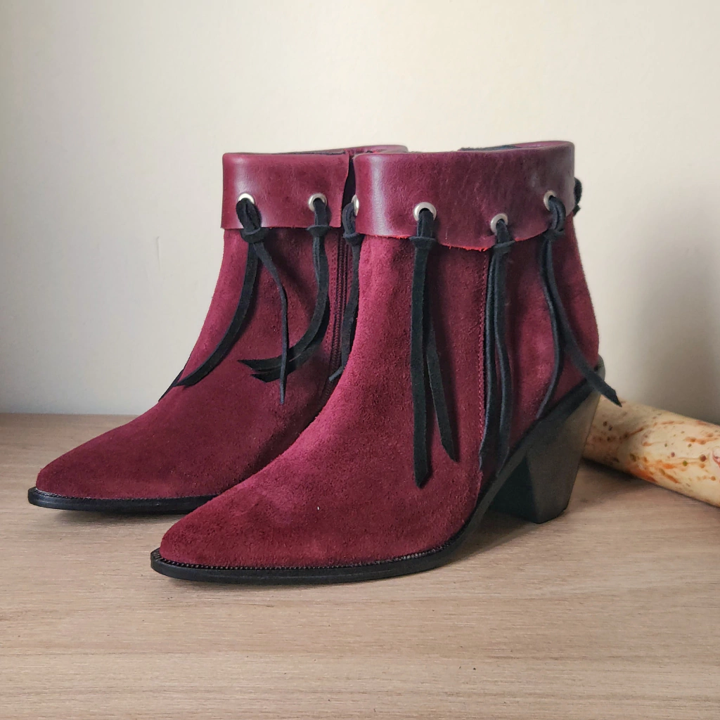 La botineta Twiggy está hecha en gamuzón vacuno color bordó. La horma es de línea texana. Lleva una solapa en cuero al tono con arandelas niqueladas. De las arandelas se atan flecos también en gamuza color negro. Estos flecos se pueden sacar y poner, para que tengas dos botitas en una. El taco mide 5.5cm y es cónico. Pintado en negro con tapa de goma y vira negra. El forro es de badana pintada de negro. Es una bota divina que se puede usar tanto con jeans como con vestidos cortos. Llevala en tu talle habitual.