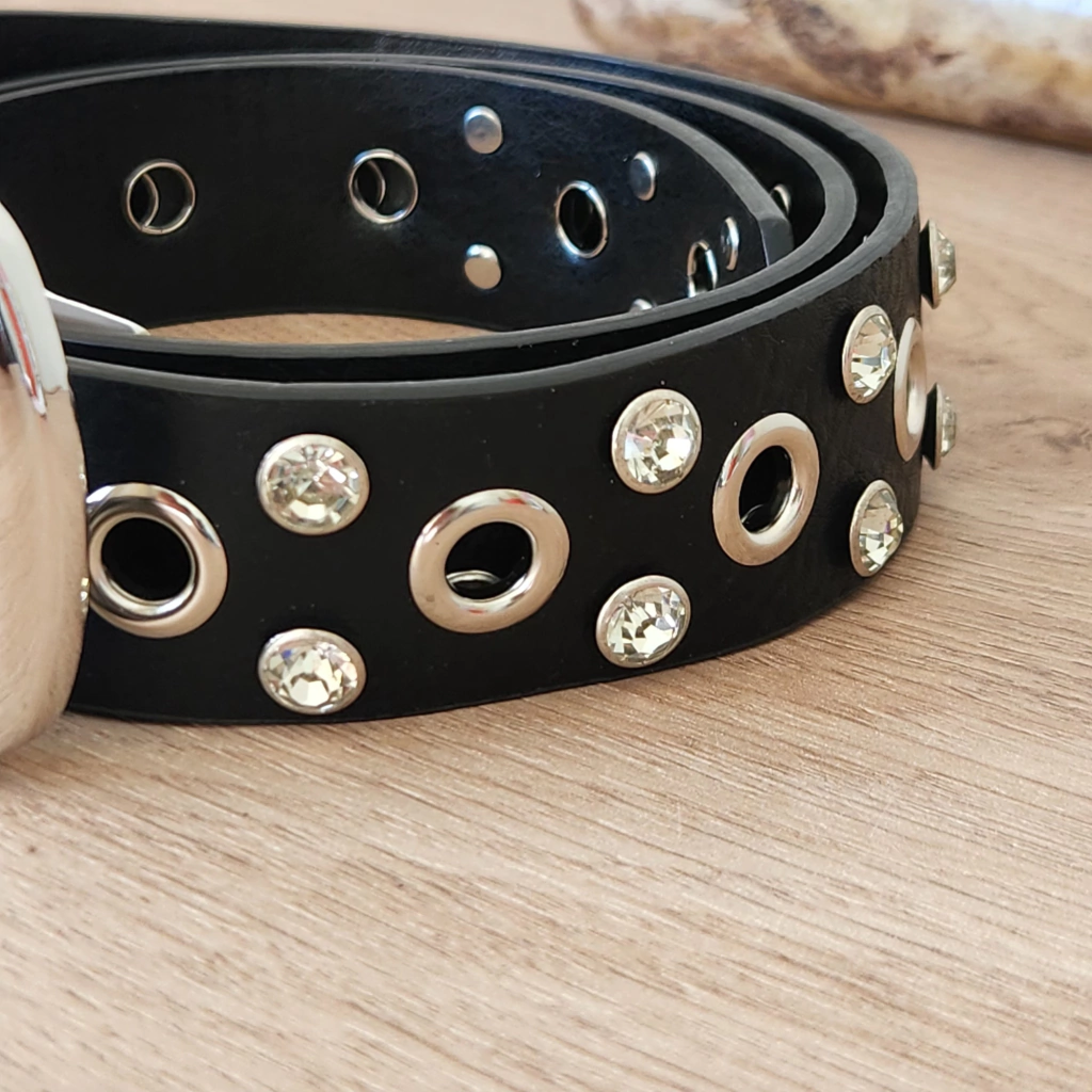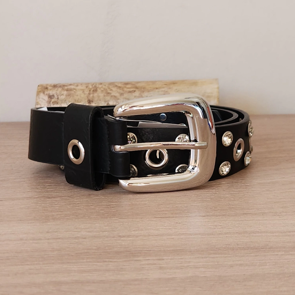 Cinto negro PU. Cinto color negro con detalles de strass y arandelas níquel.