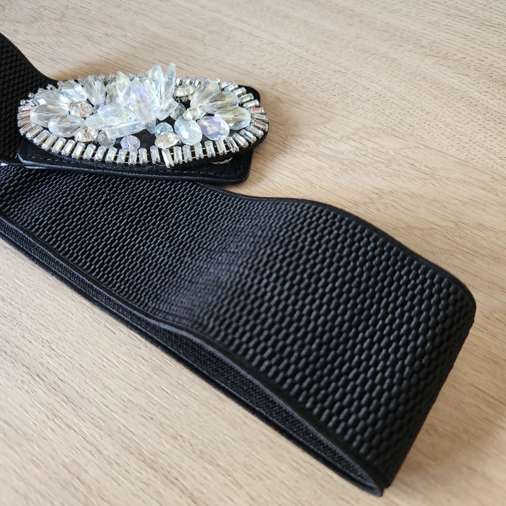 Faja de elástico negro con hebilla de cristales bordados y algunos strass. Divina para levantar un vestido básico negro o bien para usar con un jean y básica y darle un brillito especial.