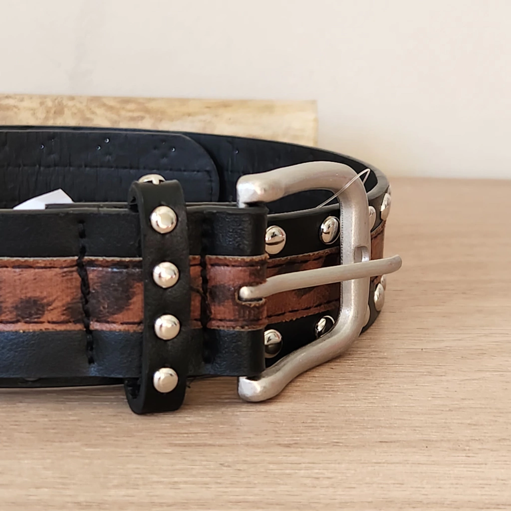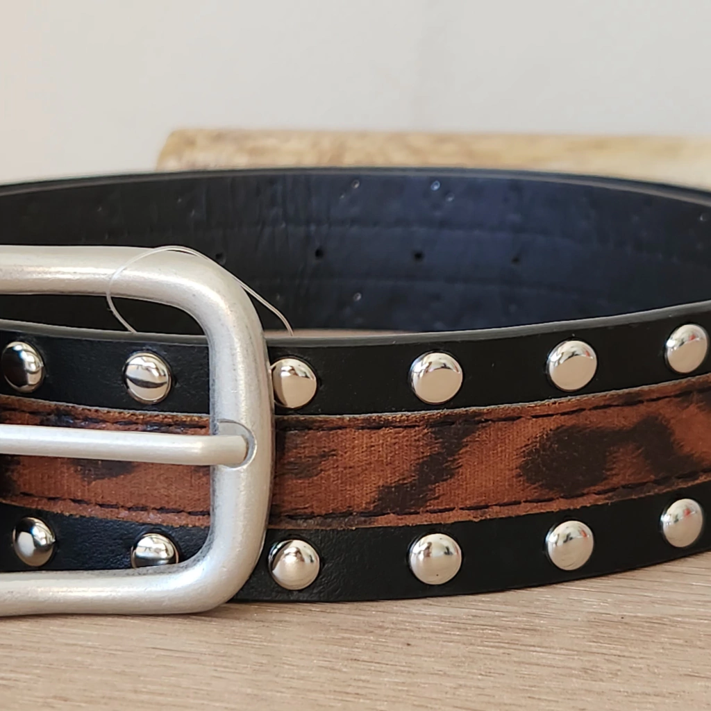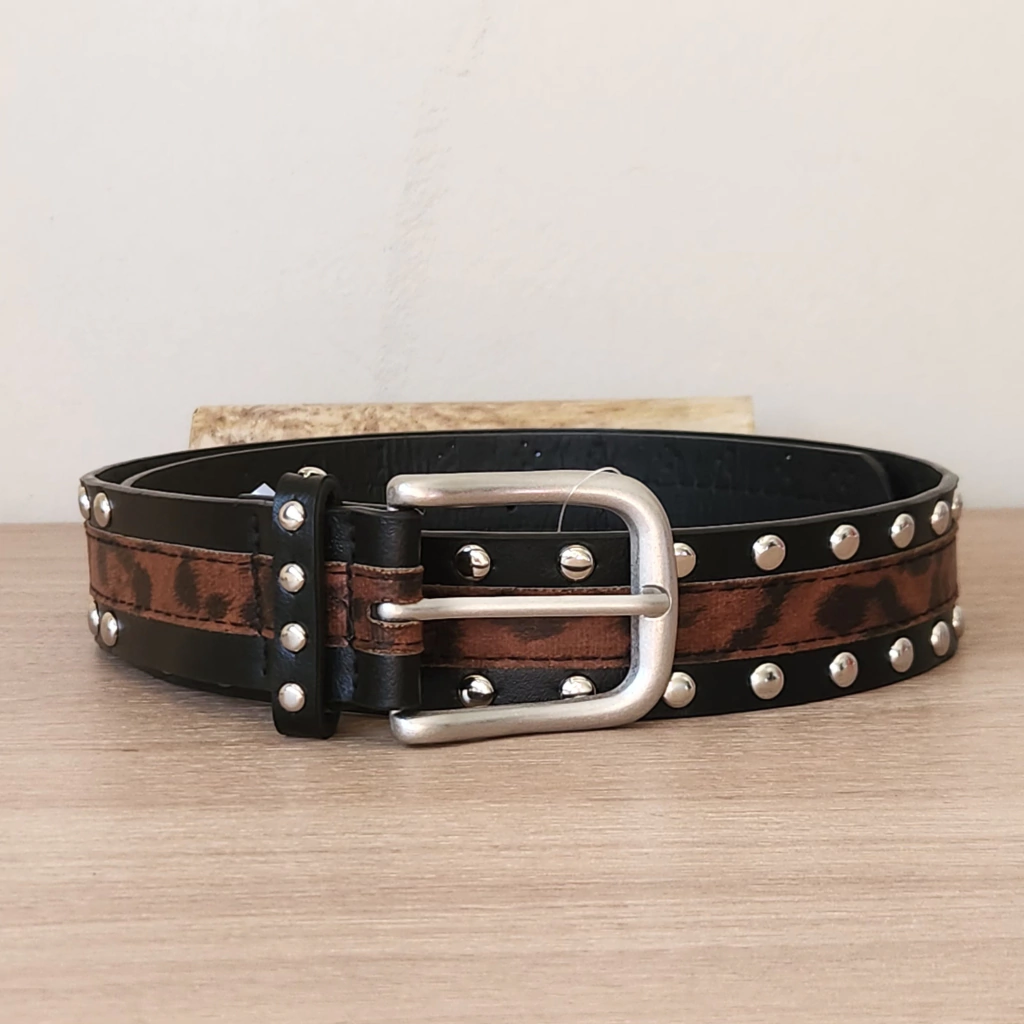 Cinto PU negro con tachas y centro animal print. Hebilla níquel.