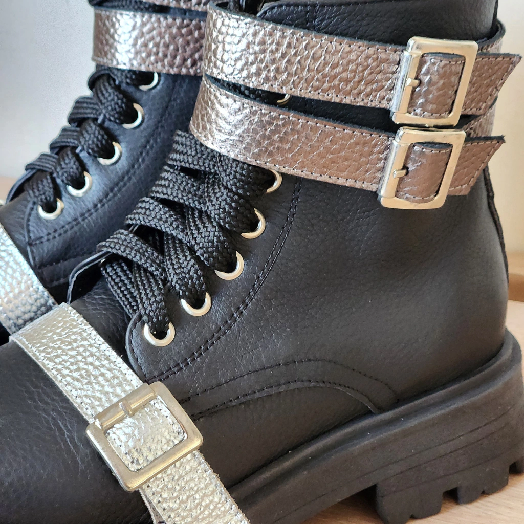 El borceguí Tripper está hecho a mano en cuero vacuno. La capellada es de cuero color negro. Está combinado con peltre y plata, así que lo vas a adaptar genial a looks de día y de noche. Se accede mediante cierre interno YKK al tono. Lleva una tira de cuero plata con hebilla níquel en la parte delantera y dos tiras de cuero peltre en la parte superior. Cordones al tono y arandelas níquel como las hebillas. Forro negro. Suela antidelizante y altita. Son abrigados, cómodos, super cancheros y livianos. Te sugerimos llevarlos en tu talle habitual.