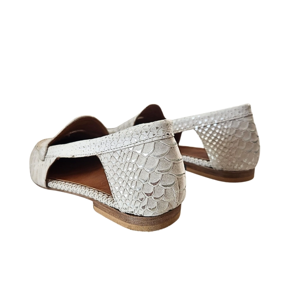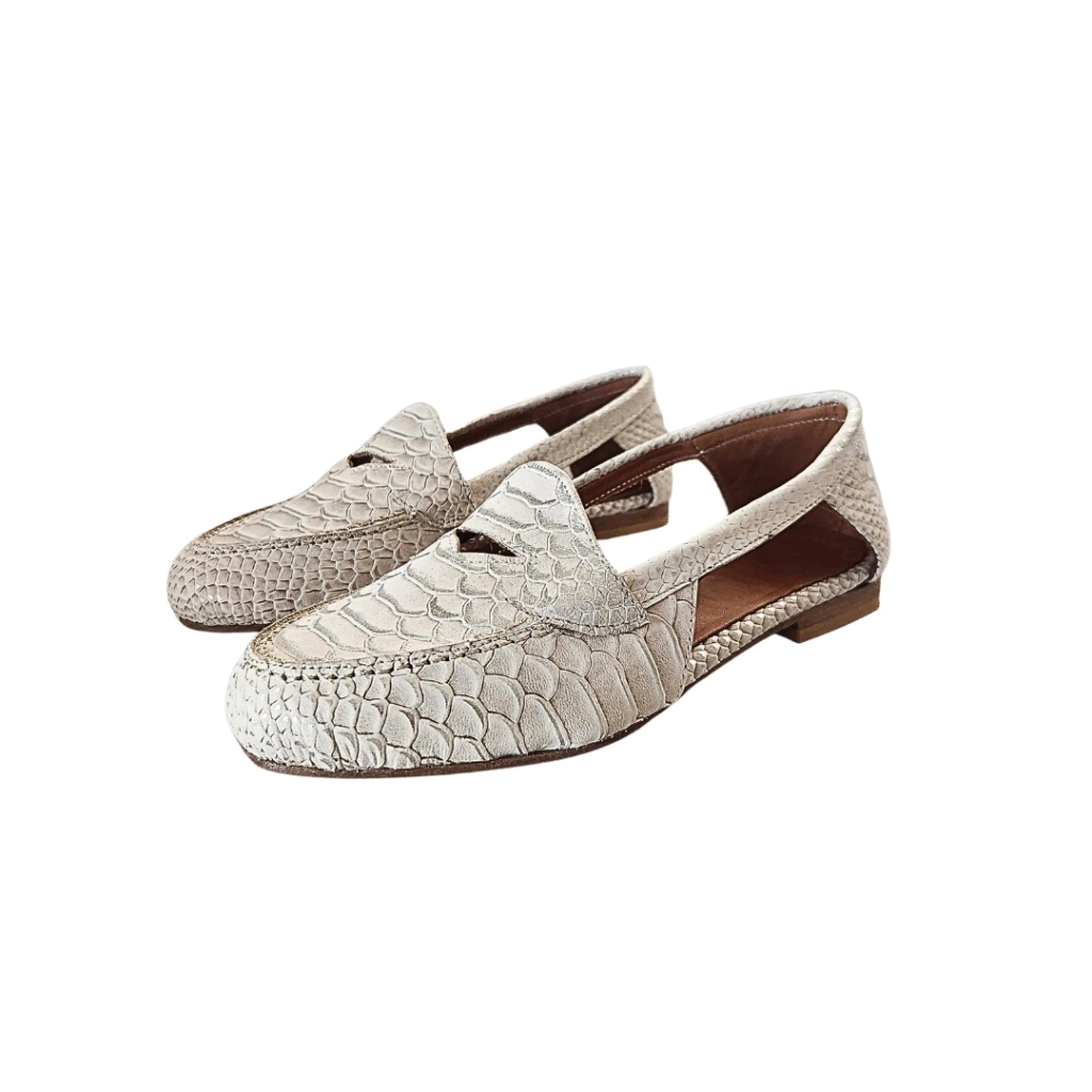 ¡Conocé el Mocasín Lila! Este modelo hecho a mano en cuero vacuno de color marfil es todo lo que necesitas para lucir increíble. Con un detalle en plata en las escamas, ¡es realmente único!