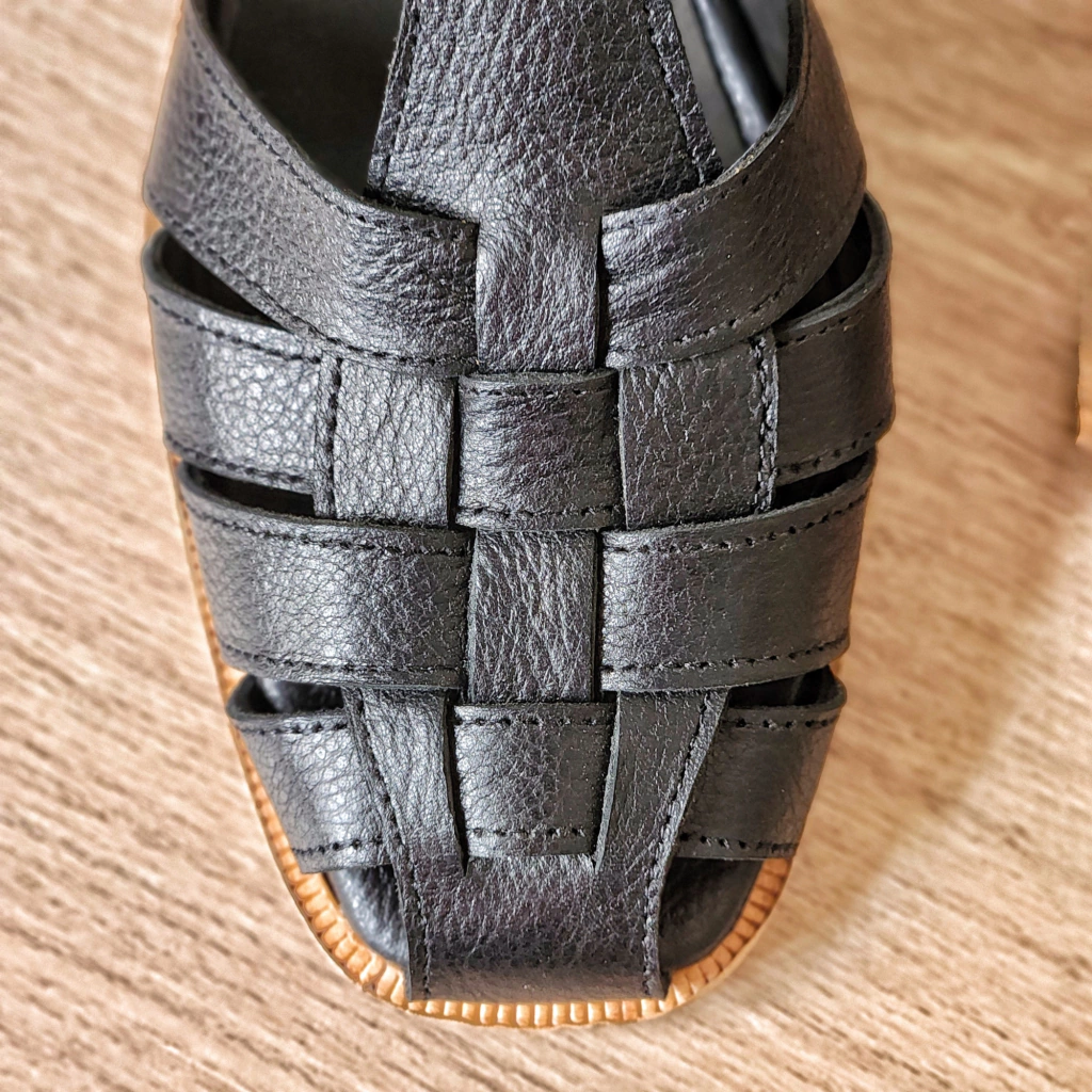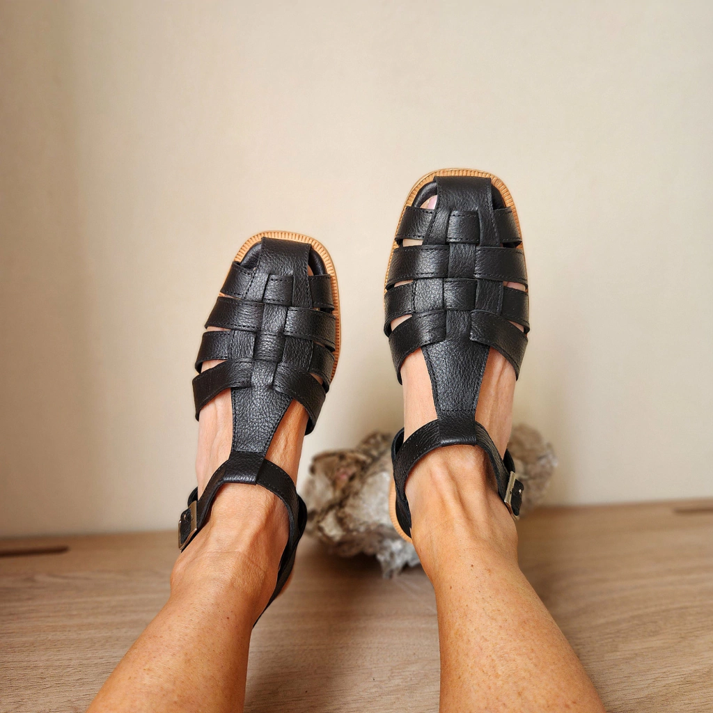 Catu es un sandalia hecha en cuero graneado color negro. Se accede mediante una hebilla. Es estilo guillermina, cubre el pie con su entretejido divino. Super tendencia pero a la vez un clásico atemporal. Está forrado en badana natural color negro. Vira de cuero. Suela de cuero. Taco pastel 1.5cm. Es genial para los días de calor en los que no querés el pie muy descubierto. Llevala tu talle habitual y caminala por todos lados esta primavera verano.
