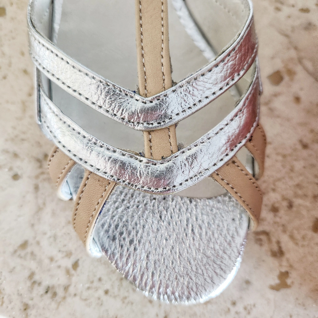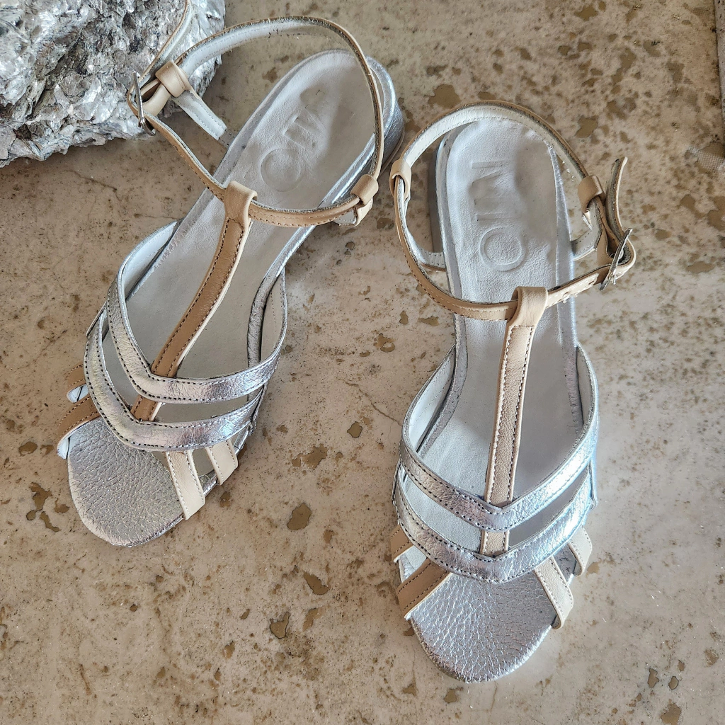 La sandalia Sol es nuestro clásico veraniego. La hacemos todos los años, una y mil veces porque es un modelo femenino, clásico y cómodo. Características de nuestra marca. Está hecha a mano en dos cueros. Predomina un cuero liso color arena, camel. En la parte de los dedos, elegimos un plateado para darle un toque sofisticado. El taco de la sandalia Sol mide 2,5cm y está forrado en el mismo cuero de la capellada. La tira T que une la pulsera con la capellada que cubre los dedos estiliza el pie. La horma es de ballerina, tiene un largo standard. Llevala en el talle que usualmente usas. Si estás en el medio punto, llevala un talle más.