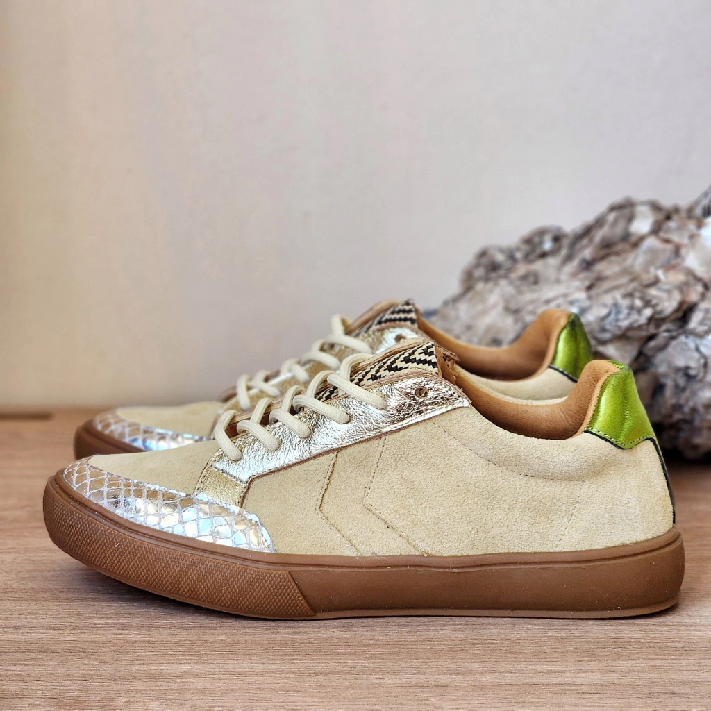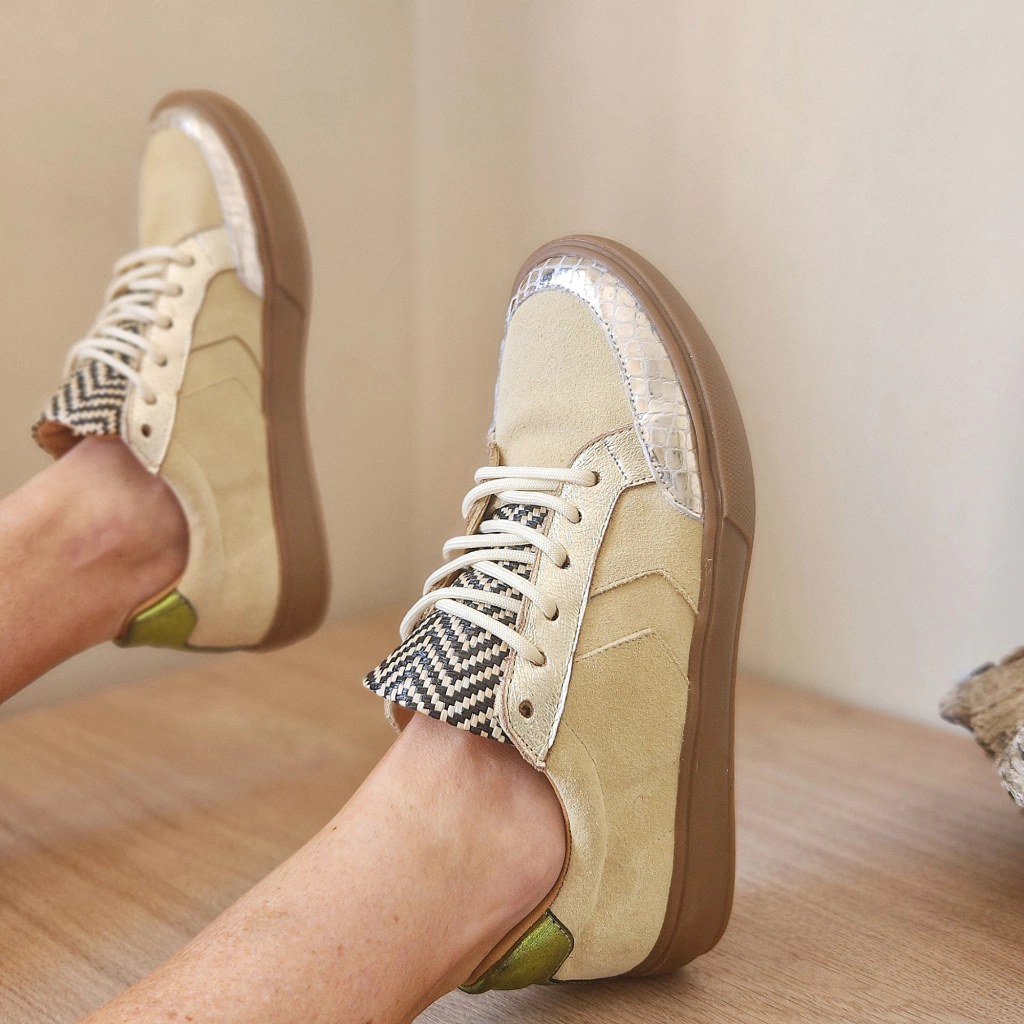 Mía es una zapatilla urbana hecha a mano en gamuzón color butter yellow (color de la temporada). Es una zapatilla muy mio, con diferentes texturas que la hacen muy original. La capellada es en gamuzón vacuno amarillo manteca. La lengüeta acolchonada en rafia al tono con detalles negros. La puntera es de cuero simil reptil metalizada, al igual que la cordonera. El talón es lima metalizado. La base de la zapatilla es color caramelo. Se accede mediante cordones. Le pusimos cordones redondos, amarillo pastel, al tono de la capellada. Trae cordones lisos caramelo para que puedas usarla de otras maneras. Llevala tu talle habitual. Si usas plantillas, te sugiero un talle más.