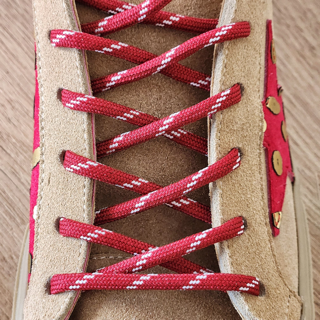 Lucky es una zapatilla urbana hecha a mano en gamuzón visón. En el lateral exterior tiene una estrella en gamuzón bordó subido con detalles pintados dorados. En el lateral interior le pusimos la misma gamuza pintada. El talón es en cuero platino. Lengüeta chunky acolchonada. La base de la zapatilla es del mismo tono de la capellada. Se accede mediante cordones. Le pusimos cordones redondos, bordó, al tono de los contrastes. Trae cordones lisos cemento para que puedas usarla de otras maneras. Llevala tu talle habitual. Si usas plantillas, te sugiero un talle más.