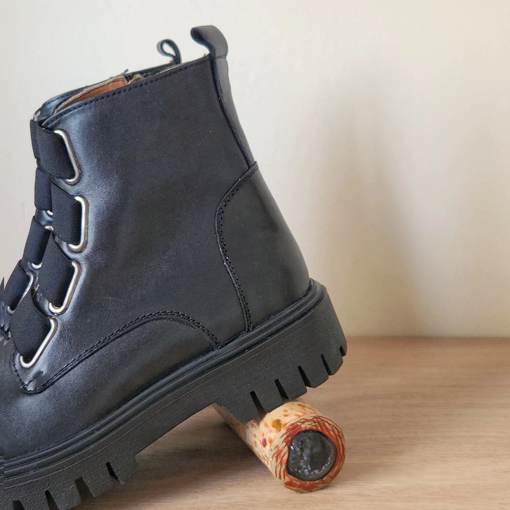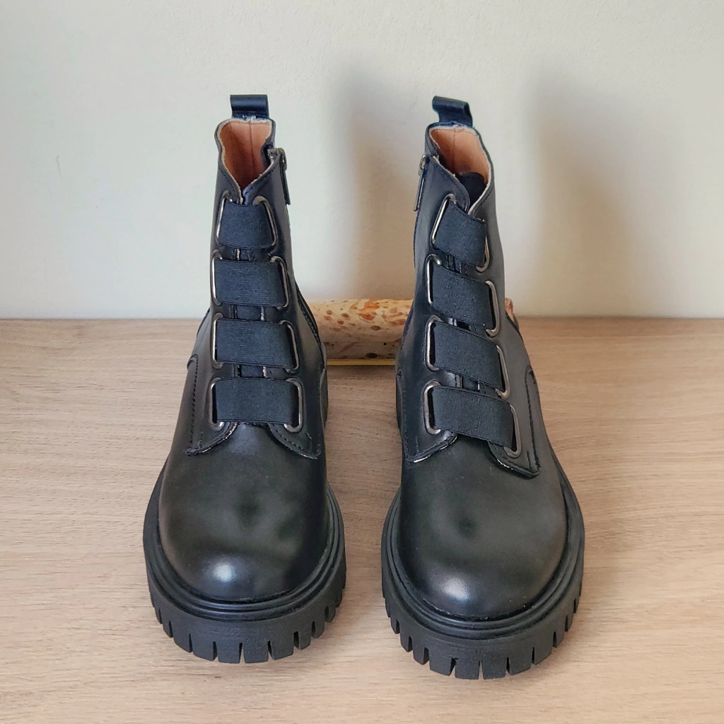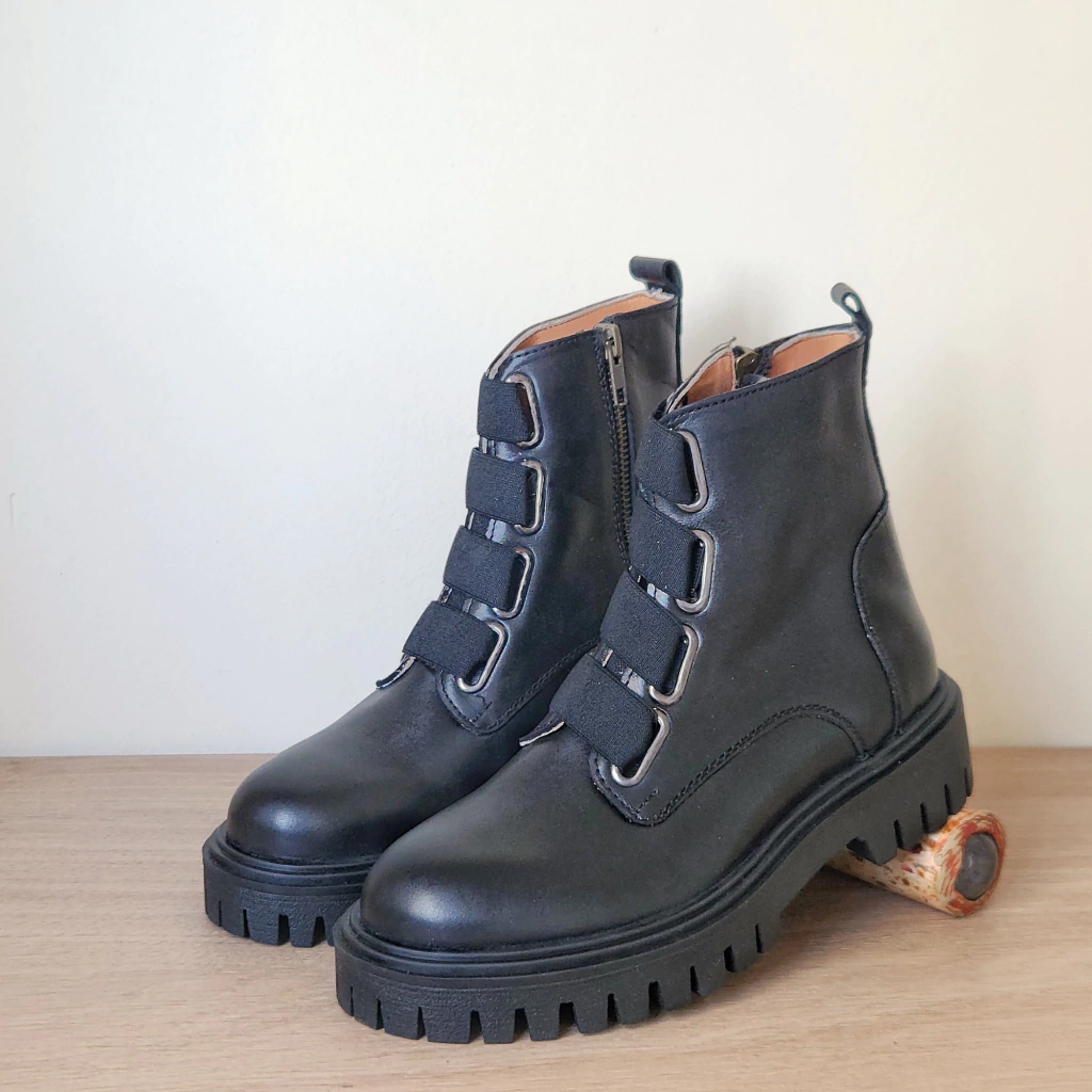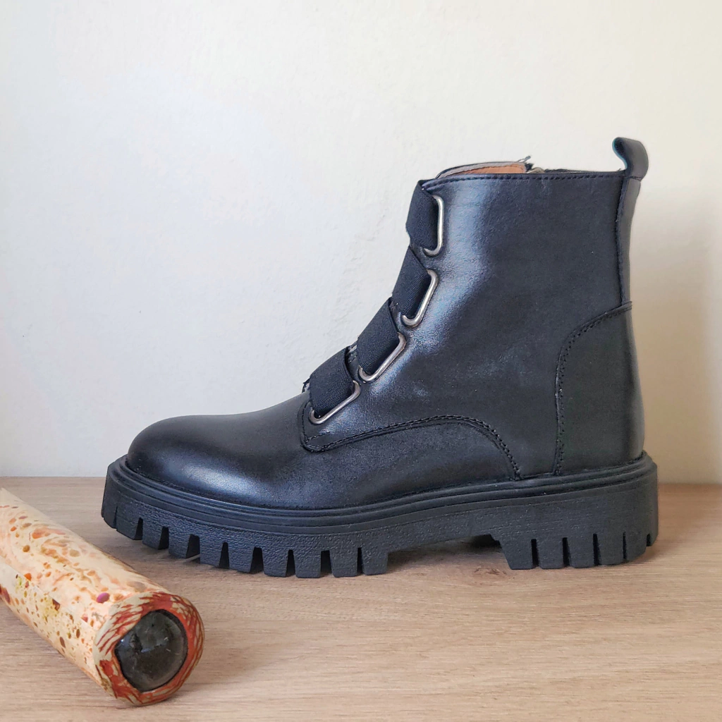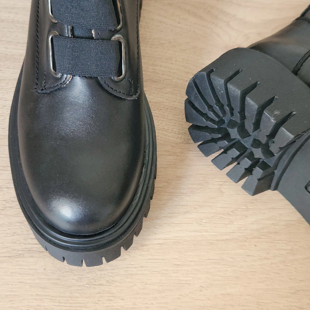 Borceguí realizado a mano en cuero vacuno color negro. Se accede mediante cierre lateral interno y lleva unos elásticos en la capellada que sujetan el empeine y le aportan un estilo diferente. Horma super cómoda. La base de este borcego está hecha en goma ruta alta antideslizante. Aporta un poco de altura y mucho confort en la pisada. Te sugerimos comprarlos en tu talle habitual. ¡No te los vas a sacar!