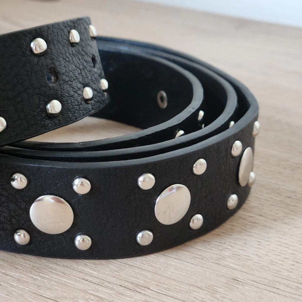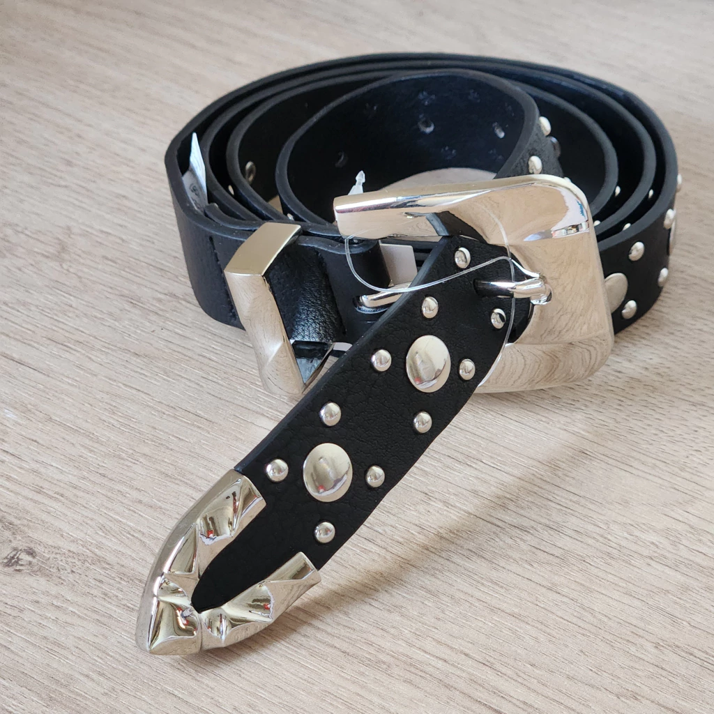 Cinto negro con detalle de tachitas mini y chapones en níquel. Puntera metalizada.