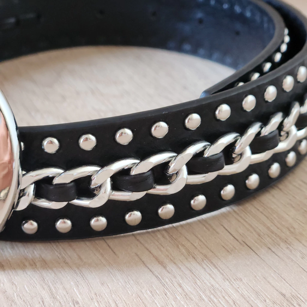 Cinto color negro con reborde de tachas níquel y el centro cadena.
